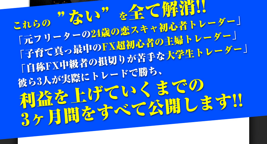 今回の恋スキャFXビギナーズ・トライをご提供するにあたって、僕や他の2人のトレーダーのリアルトレードが、多くの会員さまの投資生活の向上に役立て頂ければ嬉しいです。